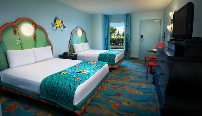 Ad Stay In the Magic At Walt Disney World Resort. The little mermaid rooms at this resort are standard rooms. The Disney Art of Animation rooms come in regular your typical two bed set-up and family suites larger rooms with two bathrooms and the space to sleep six.